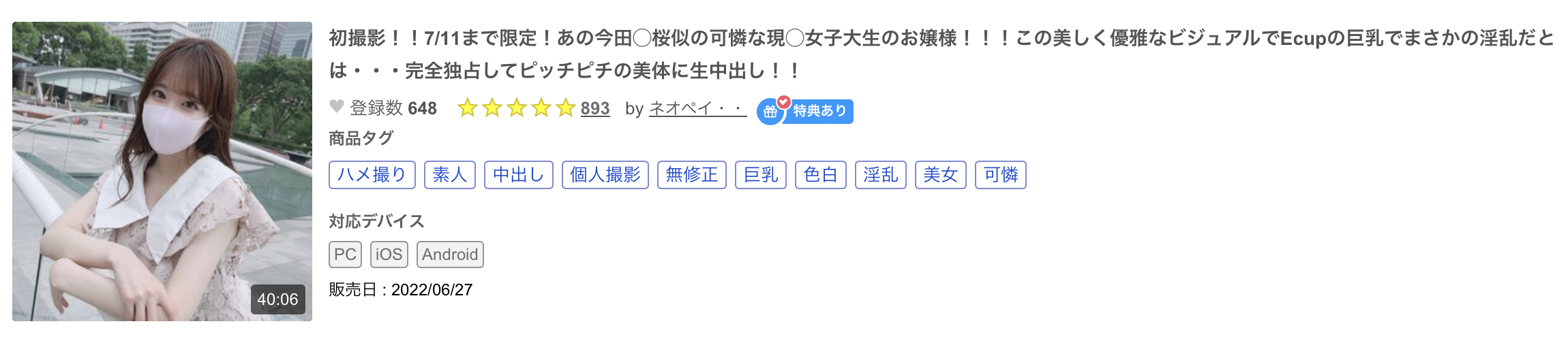 还是老话一句,现在无码片商是步兵界动作最缓慢的单位,比速度他们很难赢过FC2平台那些无码卖家,所以绫野ゆう(绫野悠)自然也不是第一次在镜头前出鲍ー早在去年6月的时候,被说很像「今田美桜」的她就和乙白さやか(乙石彩也香)一样被大神「ネオペイ・・」搞下马了(fc2-ppv-2993293),而且一次不够还两次,去年8月这支「シネマ画风!この美しく优雅なビジュアルでEcup巨乳现◯女子大生・・・色白美肌を惜しげもなく晒しピッチピチな美体に生中出し&口内射精!!」(fc2-ppv-3074048)的女主角也是她〜