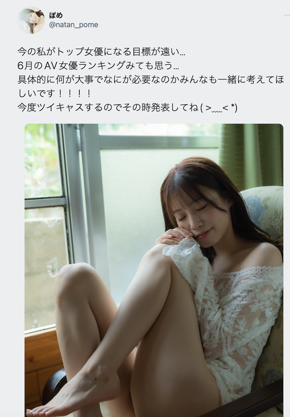 坦白说,她确实还没到最优秀的境界,最多人参考FANZA月排行榜她新片没进榜,总销售的AV女优排行榜则是排在83;周排行榜她的名次比较高,新作「恋人みたいな唯一无二の性接客してくれる“未歩なな”のイチャデレ风俗10店铺スペシャル」排在第27名,我想她之所以会有这感触应该是第一张合约已经走完了(专属12支作品),虽然继续待在S1的机会很大,但她并不满意自己的成绩⋯