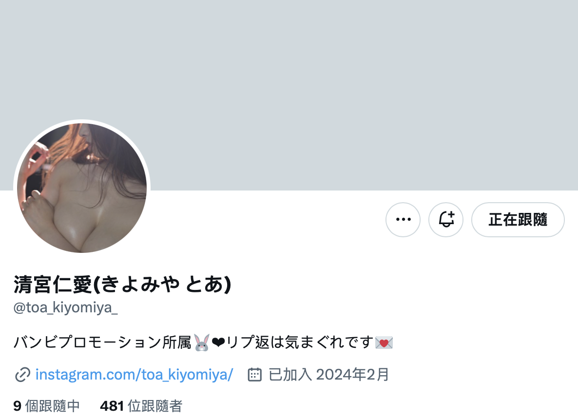 没关系,要找她的长相一点都不难,虽然X找不到但到了IG(https://www.instagram.com/toa_kiyomiya/)清宫仁爱就什么都给你看了: