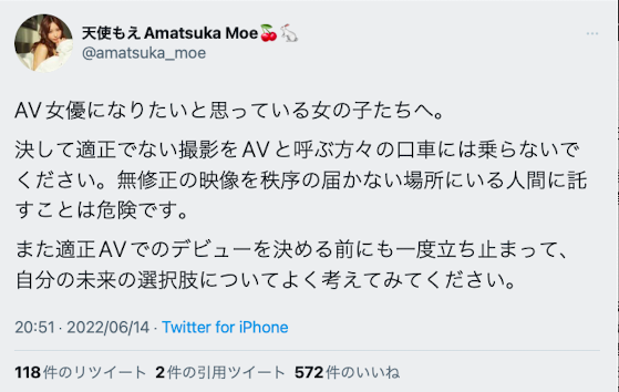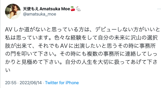她很严肃地说了,如果女孩们觉得除了拍AV已经无路可走的话那还是别跳进这个火坑,在这之前最好由各个管道打听有没有其他的选择;真的非拍AV不可,那也务必要和不只一家事务所联系,好好比较后再选择,慎重地对待自己的人生〜 哇,这字里行间真是满满悲观的味道,看来天使もえ(天使萌)已经对AV界失去希望了…