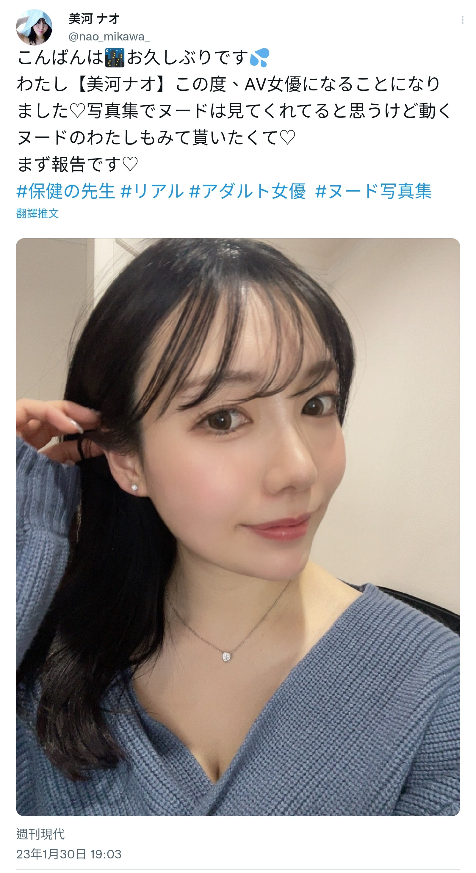 这是何方神圣呢?去年十月就有前辈叫我追踪她,说是即将出道的生力军,而看到她在週刊现代的写真我是觉得人设蛮有意思的ー美河ナオ(美河奈央)是个待在公立高中保健室上班的护士,170公分高F罩杯的她外型成熟美艳,让每个去保健室的学生都下面肿胀〜 不过话说回来,如此成熟美艳的她,会在哪一家片商出道?