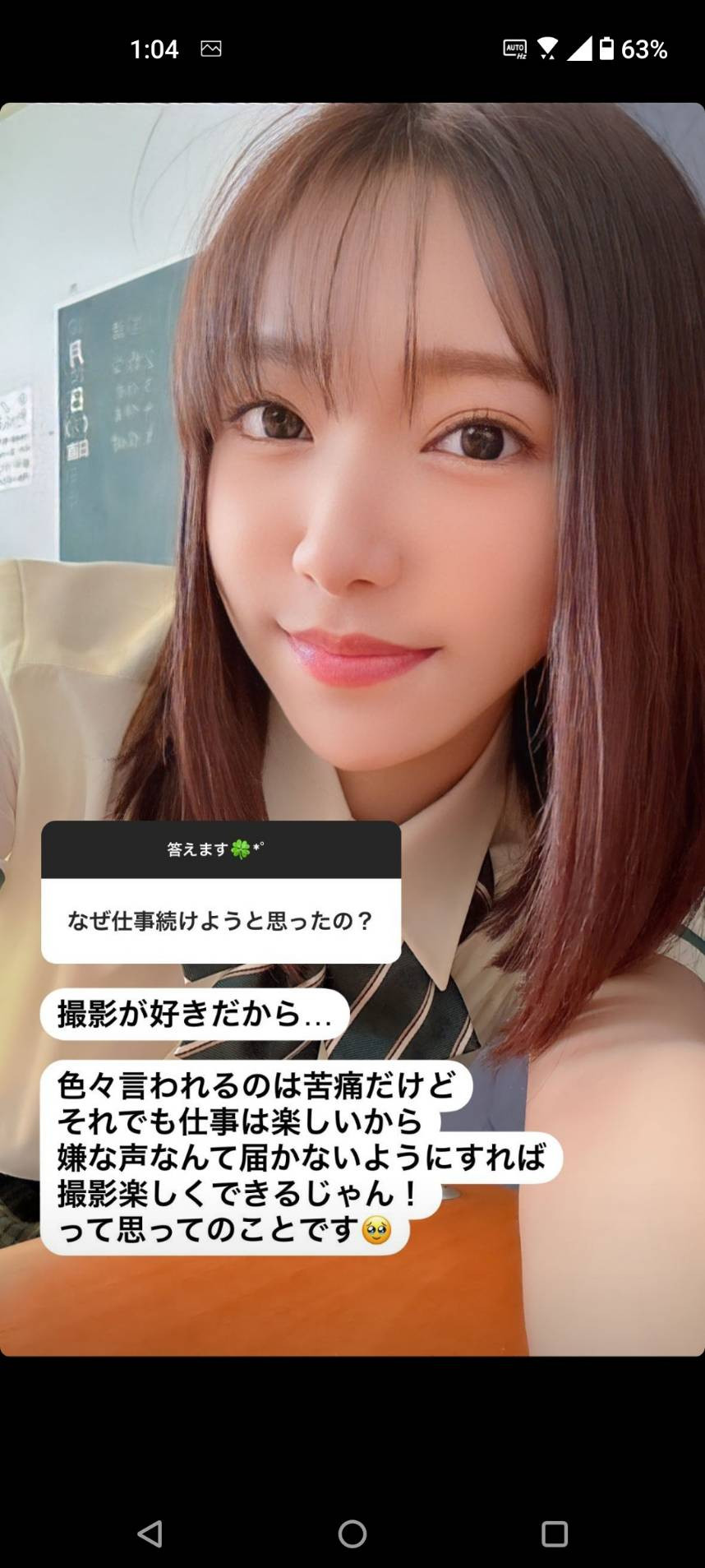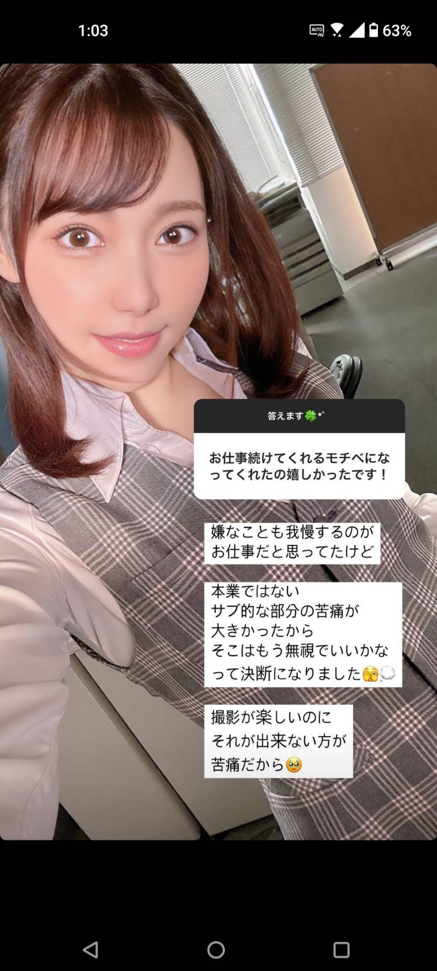 一样是IG限动,さつき芽衣(沙月芽衣)说自己前几天今年第一次开工拍片,觉得拍片现场还是很Happy的,休业淡出引退的想法也烟消云散ー之前為什麼有那麼负面的想法呢?さつき芽衣(沙月芽衣)说是因為周围的大人一直跟她强调自己的排名顺位有所下滑,让她愈想愈沮丧所以就慢慢不想去现场,可是一听到导演喊开麦拉就觉得有片子拍有炮打真是HIGH啊⋯