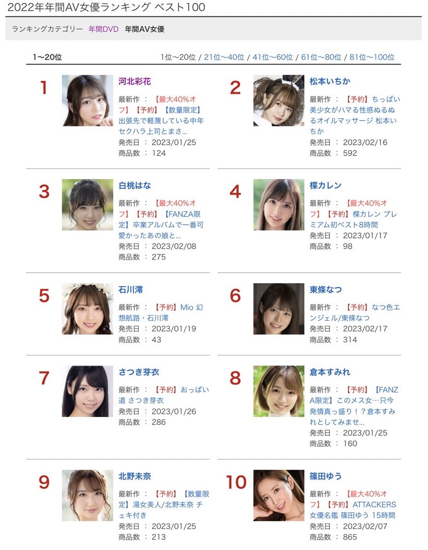 排行最前面的是北野未奈,但你说她是除了河北彩花、楪カレン(楪可怜)以及石川澪后最好的专属女优吗?非也非也,并不是说她两社专属对其他女优不公布,而是2022年她有一半的时间是到处发片的企划女优,因为买气很旺拿过月排行第一所以被片商又收了回来(因为北野一出道是E-Body的专属女优)当共同专属的女优⋯