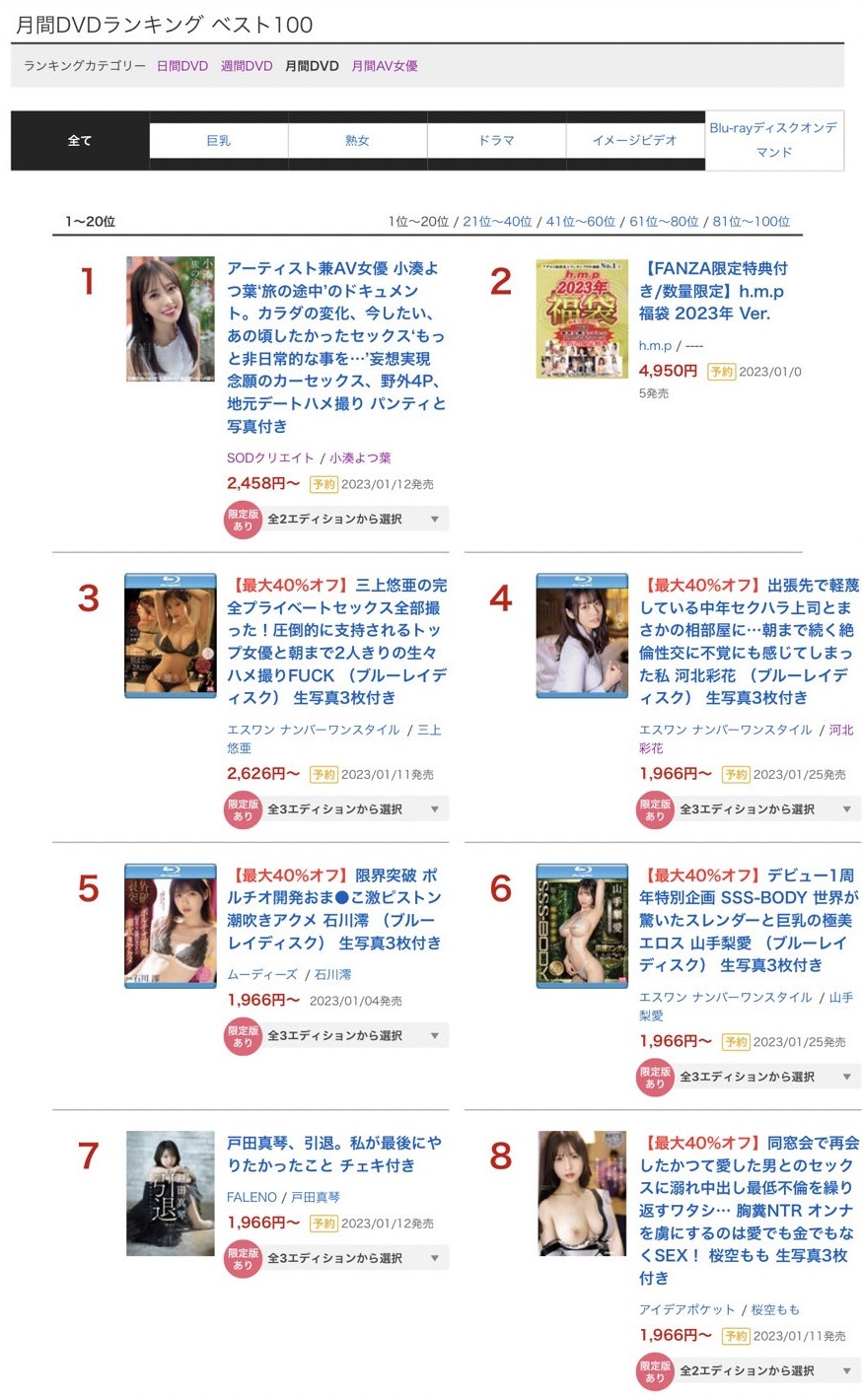 河北彩花还是很强,但石川澪上个月(2022/12)更强,可能有人会觉得奇怪,为什么小凑这么厉害在AV女优排行榜却只有第5?我个人的解释是这样的(因为FANZA不解释):首先,小凑虽然够强但还不及于全盛时期的高桥しょう子(高桥圣子),那时候的高桥真是给所有片商满满的绝望感,因为你怎么做都打不过她,但很显然地,小凑不只可以让一些发片王如「松本いちか(松本一香)」以及「小花のん(小花暖)」超车,当FANZA很多作品疯狂打折时也会让作品够多买气够好的专属女优赢过她⋯