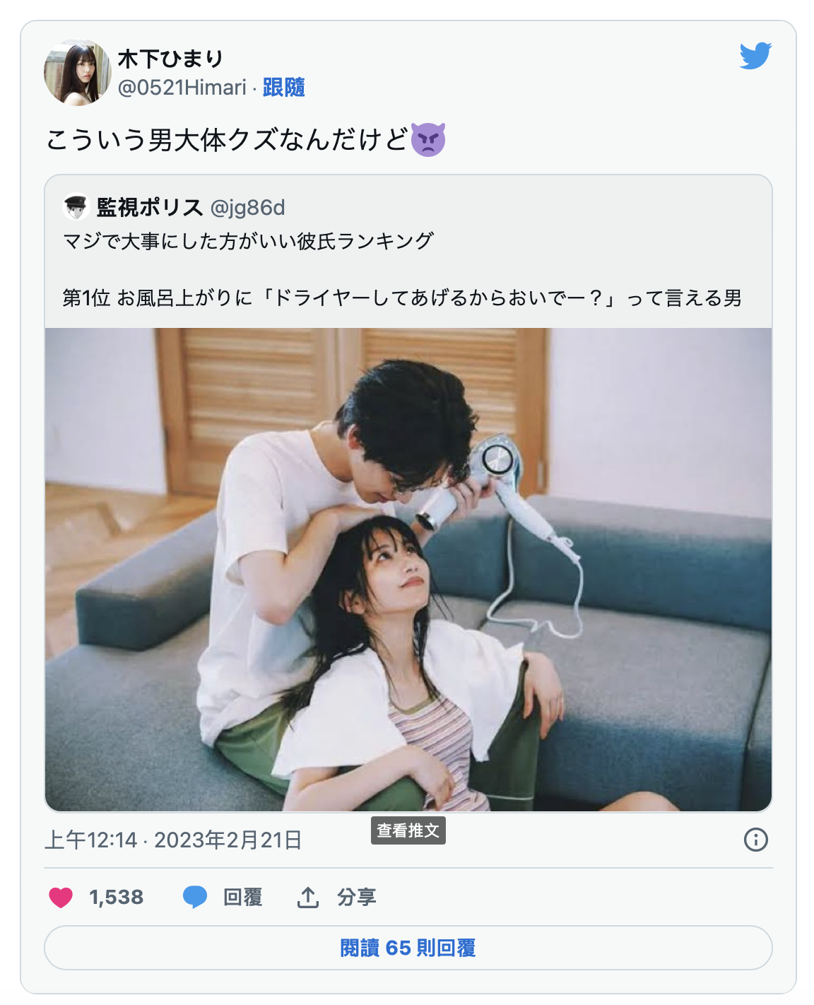 twitter帐户「监视ポリス」这篇推文是这么说的:妳应该珍惜的男人排行榜冠军,就是会在妳洗完澡后说「我来帮妳吹头发」的男人,但对此木下ひまり(木下日葵)的看法是ー