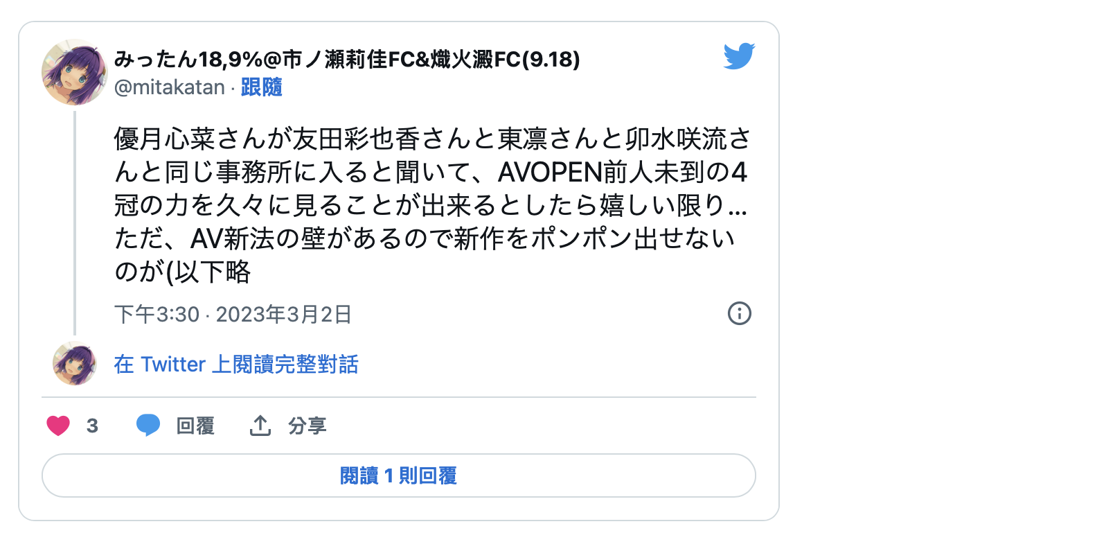 因为Diaz Group这间经纪公司的实力并不强,这一篇twitter的发文就讲了,优月心菜去的是友田彩也香、卯水咲流和东凛在的经纪公司,这三位女优知名度高不高?高;但她们发展好不好?坦白说除了友田彩也香还待在FALENO集团的熟女片商DAHLIA外其他人的存在感很低;我没有忘了水川润(由爱可奈),同样地,她也是在片商DAHLIA打拼,所以⋯