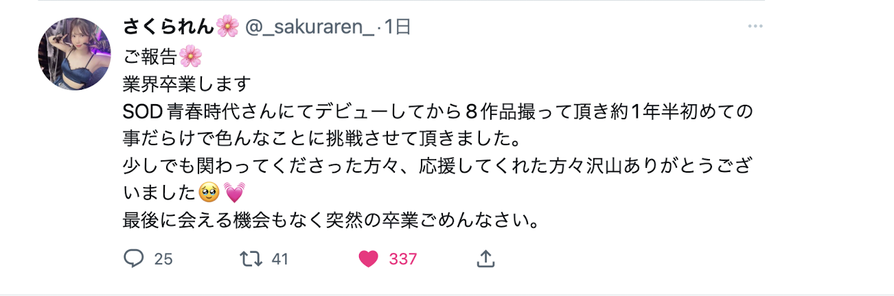 昨天她是在twitter上和大家报告说要自AV界退伍了,作品就是在青春时代发的那8支,没有引退作,也不会办见面会和大家说再见,虽然号称是19岁知道高潮的滋味以来,成为每小时至少可以高潮两次的天才少女,但未来她爽到发疯的模样就不会再公开给人看了⋯