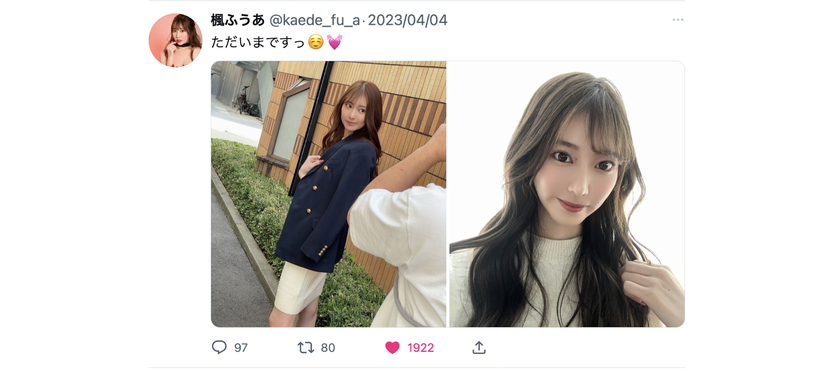 片商S1的专属女优、人高腿长奶又大的枫ふうあ(枫富爱)昨晚在直播间宣布更换事务所,加入C-More这个大家庭,艺名不变、twitter也不变(https://twitter.com/kaede_fu_a/)、然后,她仍然是片商S1的专属女优〜
