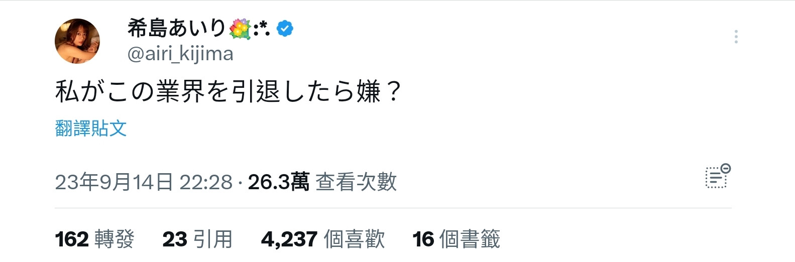 这话讲得直接,完全没有暧昧空间,意思就是直接问影迷了「如果我从业界引退了、你们会不开心吗?」;闯荡AV界多年,相信大家都知道像希岛这样的大型女优不会是影迷决定生死ー意思就是她事情不少,是两家片商的专属女优、曾参加偶像团体、会单独开演唱会然后现在还成了作家,一般来说这种女优如果引退大多是自己不想干,不是因为没人爱了只能黯然离去⋯
