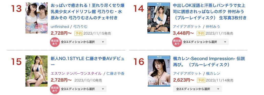 看不出来也没关系,我直接宣布答案:首先,这五支作品只有枫カレン(枫花恋)的没有标记「 【数量限定】 」,也就是她这支复活的作品就是放在那边爱买多少就买多少,没有「限量是残酷的」这回事;再来,其他作品为什么要数量限定?因为那都附有特典,一般都是生写真(写真照),枫又不限量看起来又没有要送照片,对于某些很在乎特典的粉丝来说就比较没有吸引力〜