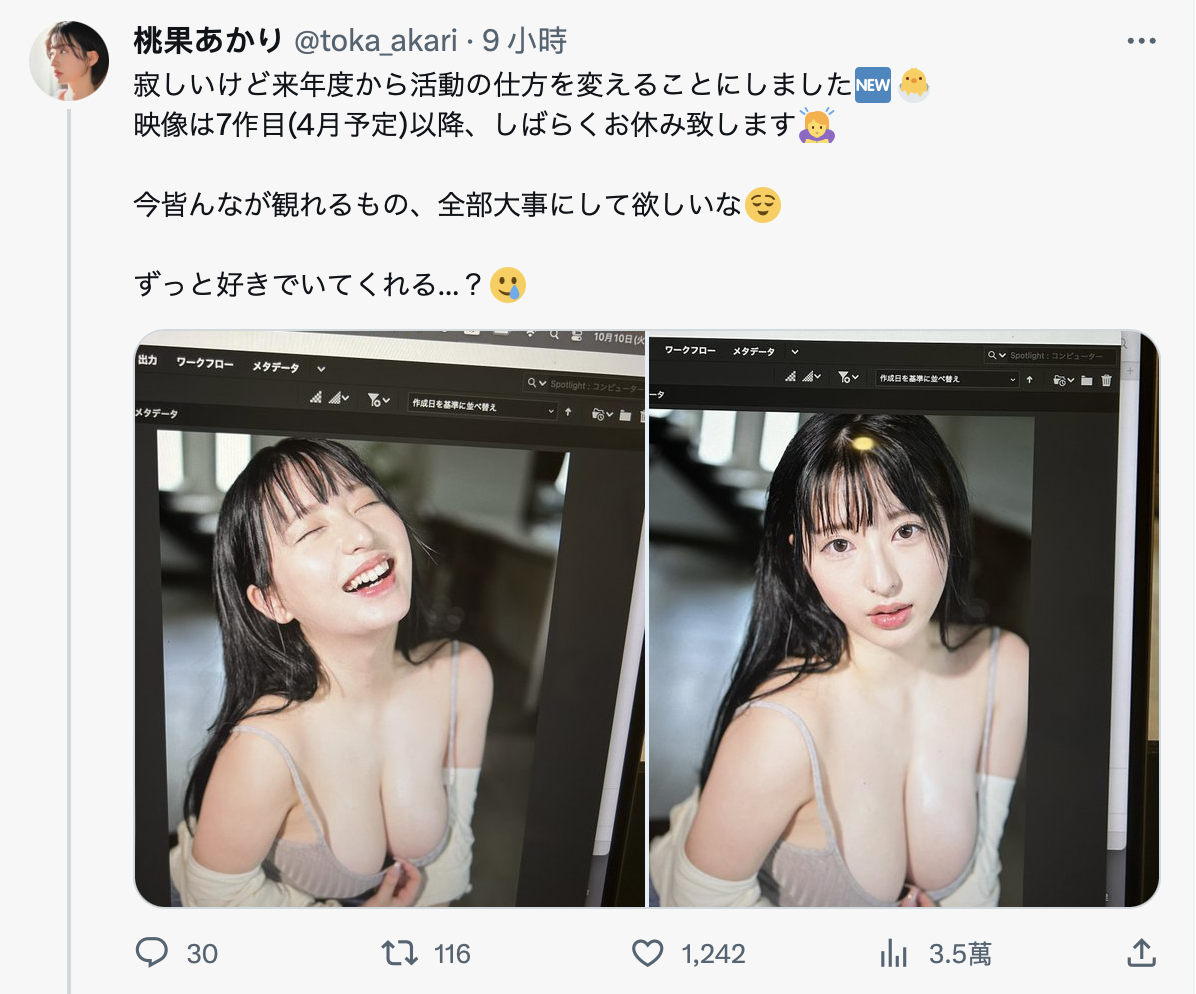不过凡事总有例外,S1所属的天然I罩杯女优「桃果あかり(桃果明里)」就在twitter明说自己将会在第七支作品后暂时退出发片行列,而这支作品预定上市的时间是明年四月〜