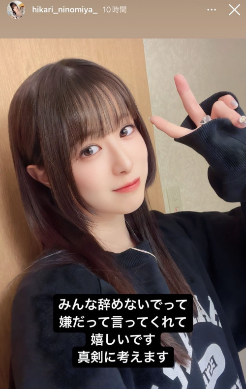 而在看完大家的回应后,二宫ひかり(二宫光)又PO了限动说「既然大家都说不想看到我引退」、「那我就好好再考虑一下(引退的事)」:其实她话没讲死,没说不退了也没说还是要退,我个人觉得应该不会退休,希望她不要打脸〜