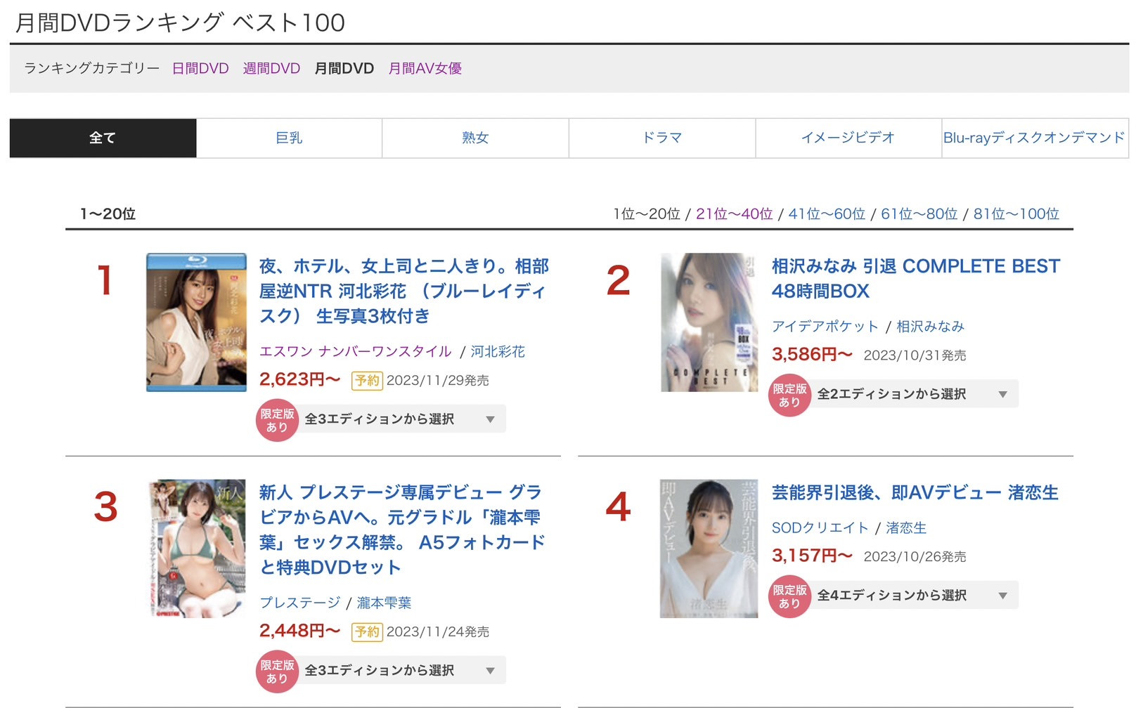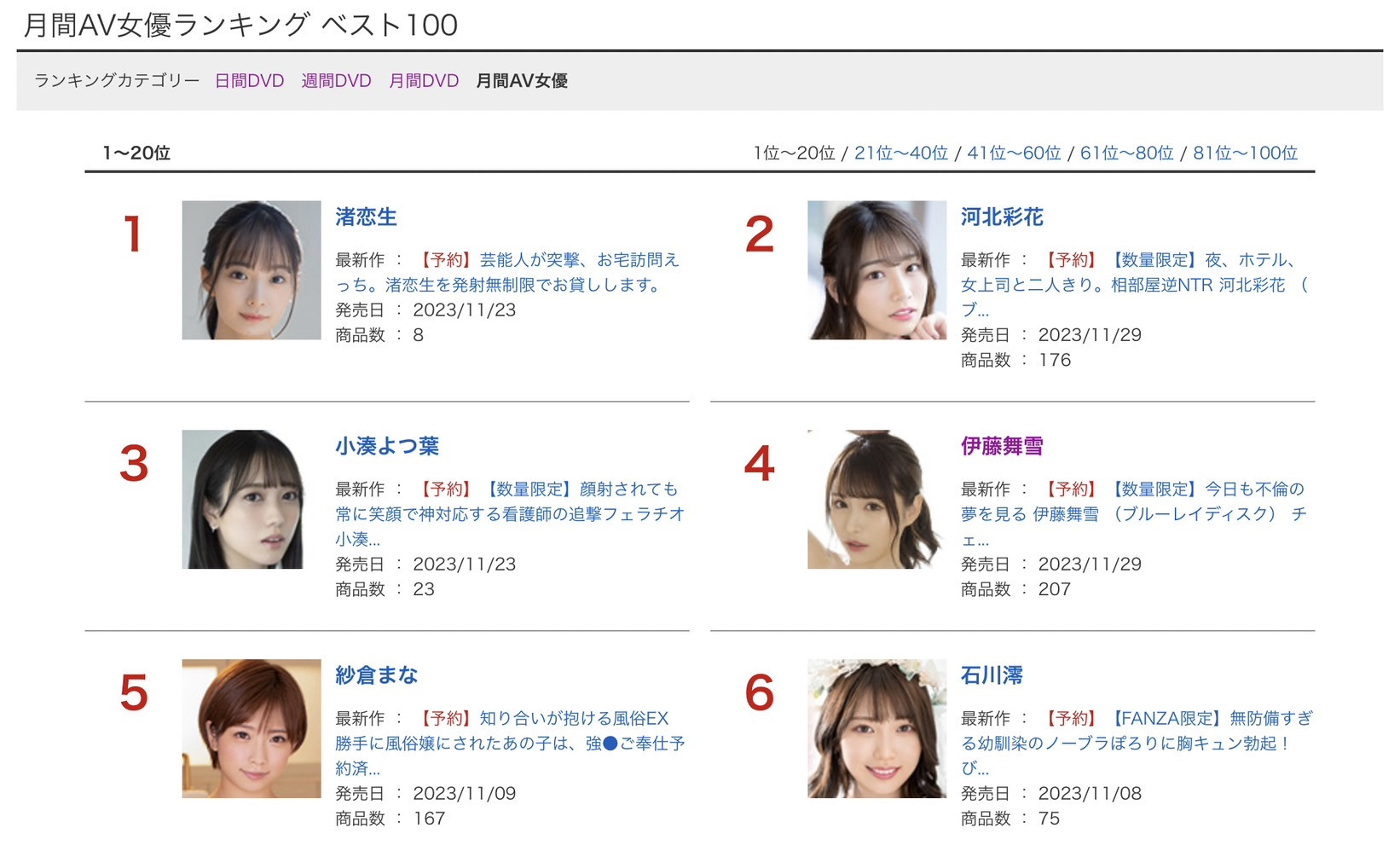 首先来看的是FANZA的通贩排行榜:我先来解释这个排行榜的意义,这是由业界最大的卖片网站FANZA(DMM)统计的数据,主要是依据每个月实体DVD及蓝光的销售数字做排行,这不像串流影片,你可以买比较低画质的作品又或者只看7天就不能看了,所以卖出去的每一支作品都代表影迷的爱;但这个排行榜也有他们的问题,虽然日本还是有在贩售蓝光机,不过现在会看实体片的影迷确实愈来愈少,不但有业界中人爆料现在的实体片最多卖个500片,也有人私下和我说这个通贩排行榜的每一名相差非常有限,因为大家的买气都不好⋯