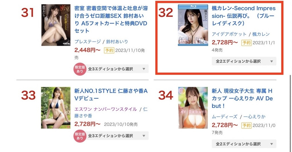 其实我觉得这个月最重要的就是她的复活,但可惜的是明明话题性十足但她的销售排行始终只是「还好」,在月排行榜最后是排在第32名,落后另一位复活还改了名字的「小那海あや(小那海绫)」一截。我曾经为此写过文章,认为是因为公布作品时没有特典商品再加上促销商品太多削弱了作品的买气,但我还是要说看到这样的成绩还是有点可惜,明明IP社规格开出来了,最应该冲的就是销售排行榜的排名,结果枫カレン(枫花恋)却连前十名都没排进去⋯