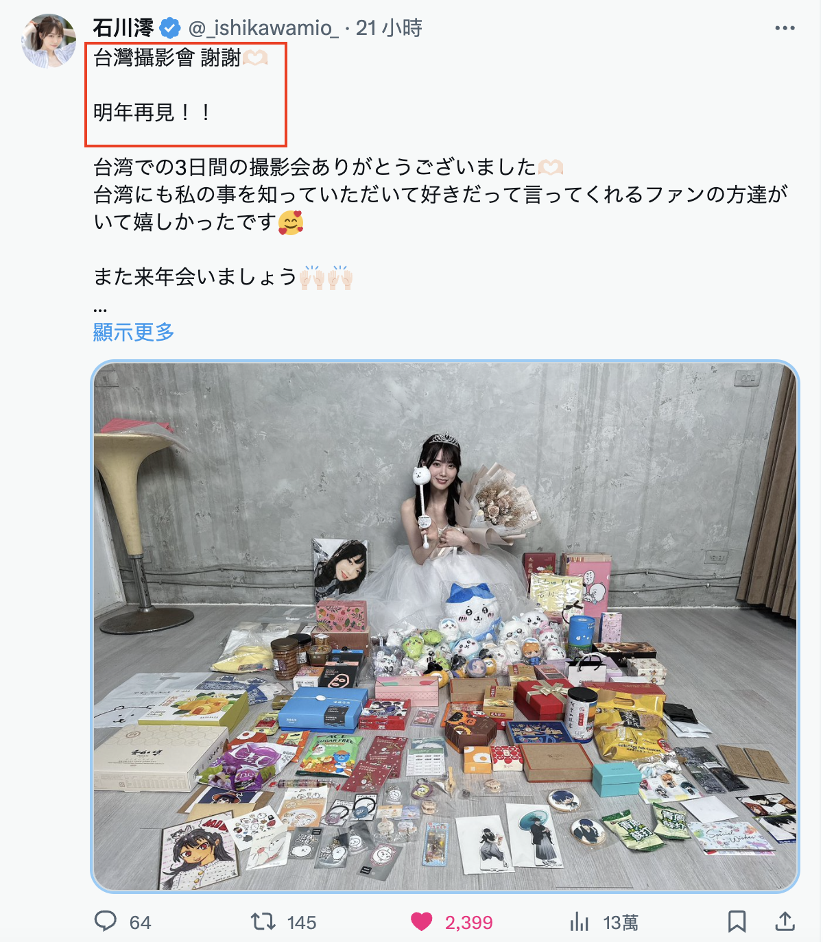 所以摄影会大成功,感受到粉丝热情的她超开心的,昨天在上飞机前时离情依依的她直接问了还有没有合作的机会,大家相约明年春天要再办一次活动ーForAVer也要好好加油了,现在的状况是摄影会的名额有限,报不到名的粉丝太多,如果没有要限制,那就要想办法增加场次了⋯