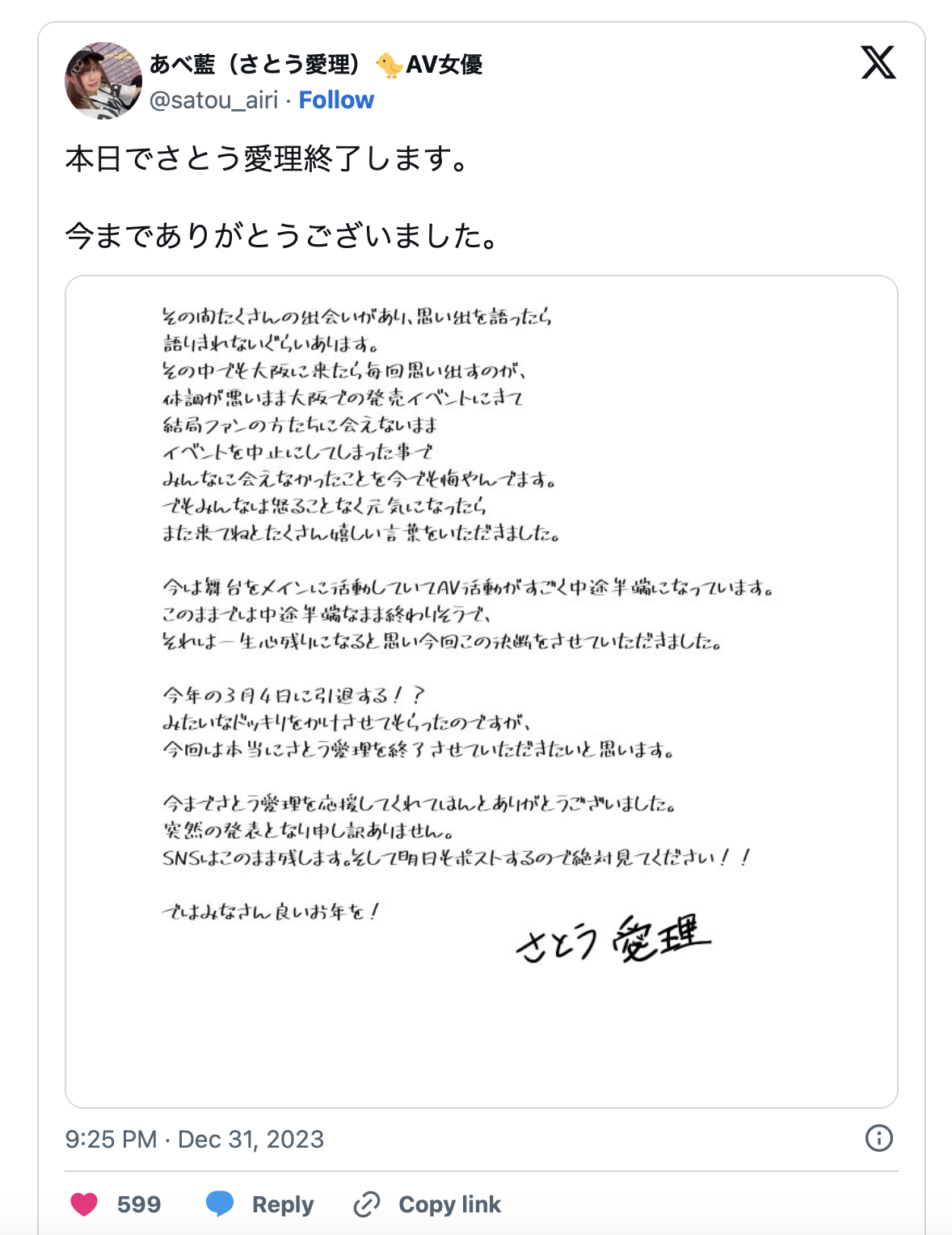 虽然有人说朝令有错夕改又何妨,不过さとう爱理(佐藤爱理)真的是装肖仔,所以我的第一个想法是她该不会是用引退的手段换事务所吧?结果她又说了,自己并没有更换事务所,仍然是ALOHA Promotion的人;而换了名字后她仍然是AV和舞台剧并行⋯