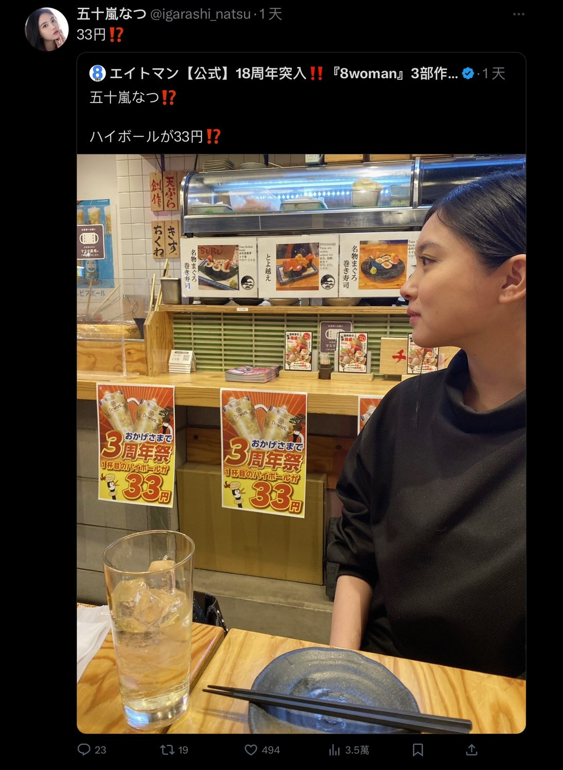 其实也没写什么,就是经纪公司发文说在居酒屋的五十岚なつ(五十岚夏)发现一杯ハイボール(HighBall)只要33円(台币7元左右),这大概是和欧阳妮妮发现口袋有200元一样是个无聊的新闻;不过重点是好久不见的五十岚なつ(五十岚夏)借着这篇发文重回大家的视野,在相隔五个月后表态「我还在」: