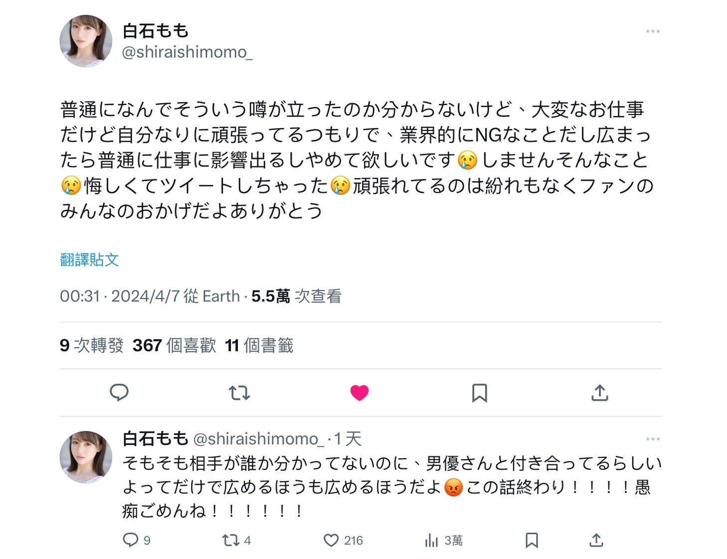 白石もも(白石桃)有在接下来的发文说清楚讲明白(她真的很气):AV女优是份竞争激烈的工作,她每天都小心翼翼全力以赴,如果谣言属实,那肯定会让工作受到影响ー这大概可以从两方面来看,与男优谈恋爱可能会让她无心工作,事情传出去还会让大家觉得她是个不专业、犯了业界禁忌的女优,那会导致大家不愿意找她拍片,负作用很大很大: