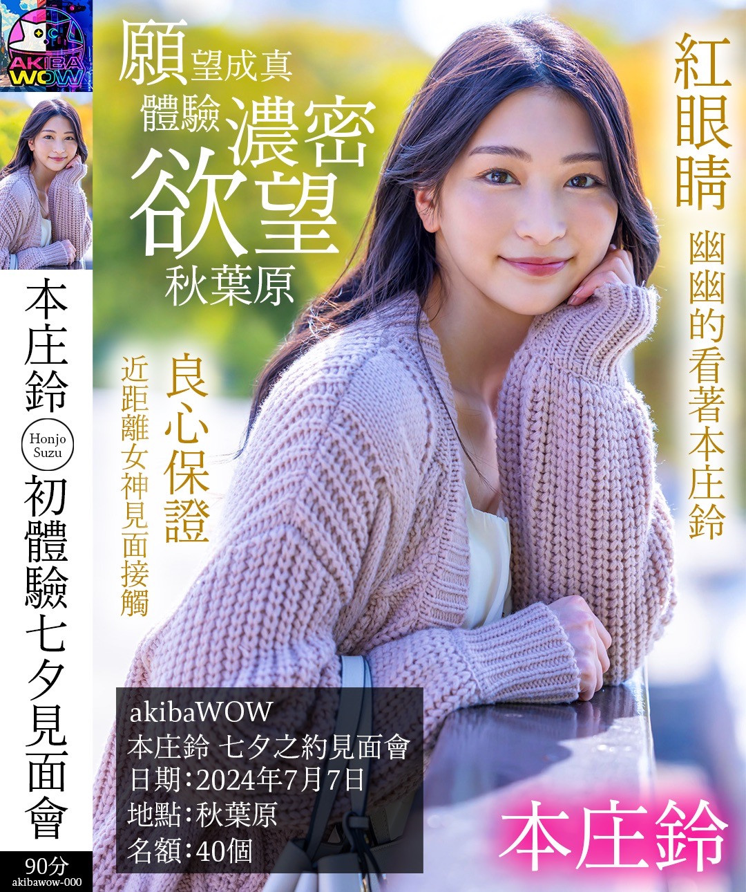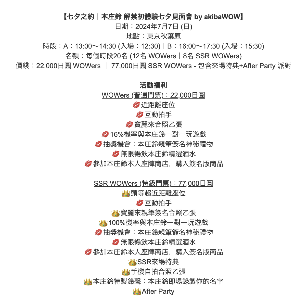 郑重为大家介绍这个活动,这是由厂商AkibaWOW为本庄铃举办的「七夕见面会」:时间是这个星期天的7月7日,地点是在东京的秋叶原,业者本身也是粉丝,所以特别知道咱们AVer想要什么:这次总共分两场活动,一次一个半小时,每个时段限量20位影迷,分成12位的「WOWer」和8位的「SSR WOWer」,两者有什么差别呢?让我截图给大家看: