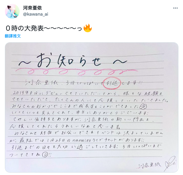 没有埋怨,只有满满的感谢,河奈亜依宣布将会在3月的时候引退,由於肺炎疫情又爆炸,所以她还没办法确定有没有面对面和大家告别的机会,只能先透过直播说再见〜