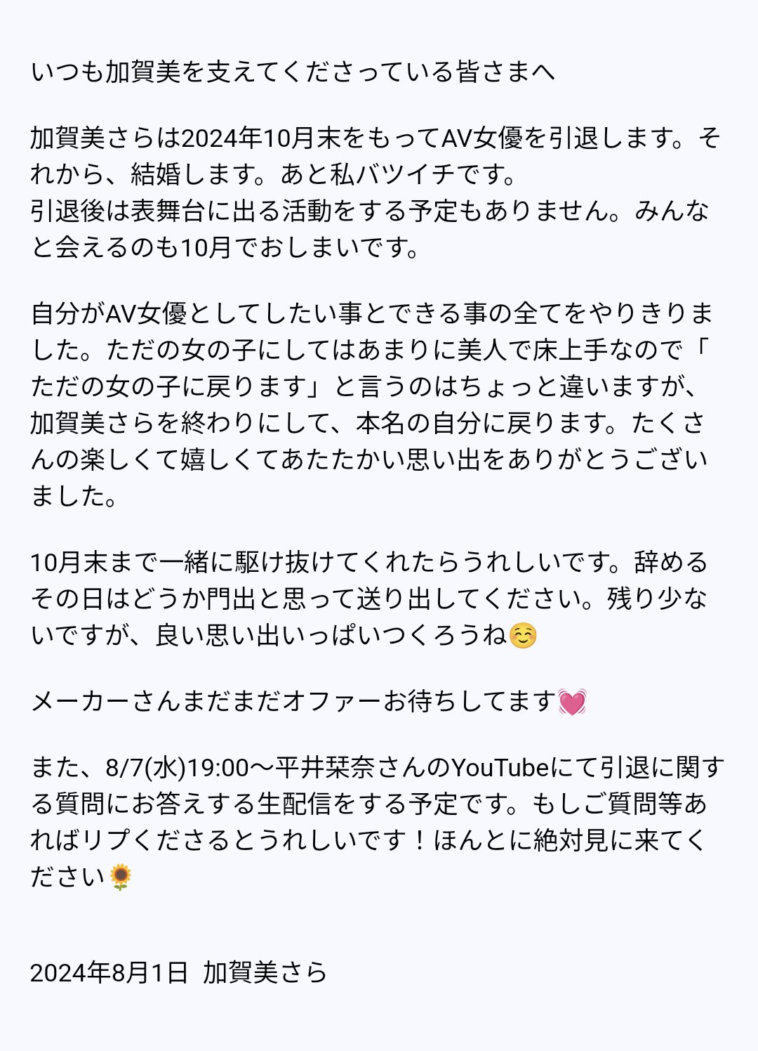 因为她的引退声明是这么写的:「致支持加贺美さら(加贺美沙罗)的朋友们,我即将在10月底引退不做AV女优了,然后,我要结婚了ー对了,我是二婚喔。」
