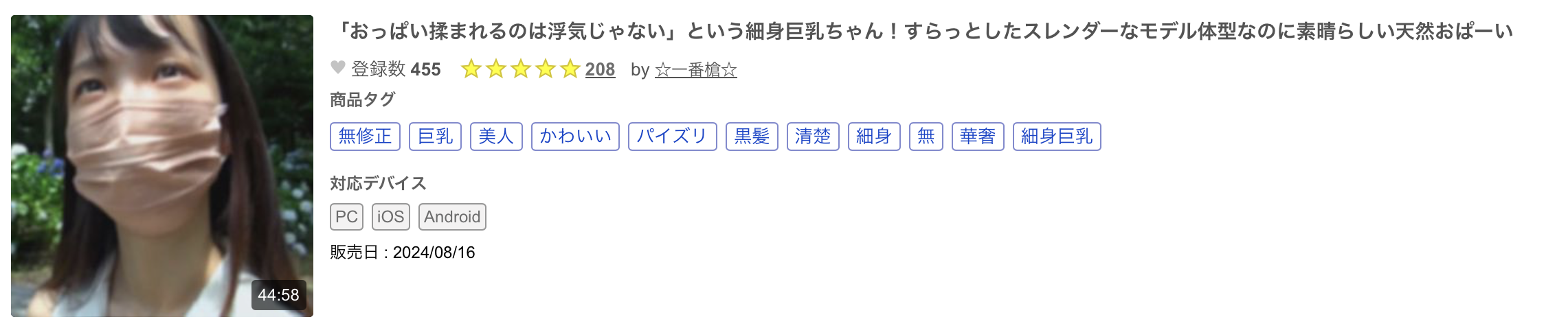 来看这支番号为FC2-PPV-4516449的作品『「おっぱい揉まれるのは浮気じゃない」という细身巨乳ちゃん!すらっとしたスレンダーなモデル体型なのに素晴らしい天然おぱーい』,这是一支女优大多数时间都戴着口罩演出的出鲍片,不过有没有脱口罩没差啦,除了模特儿的高挑细身体型和F罩杯的奶子外,神谷のこ(神谷乃子)有个超级好辨认的特征,就是左乳下方那块黑色的胎记〜