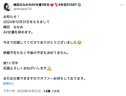 这次宣布引退的是在片商Madonna出道的「峰田ななみ(峰田七海)」,我们一块儿来看看她在X(https://x.com/mineta773)上写了什么: