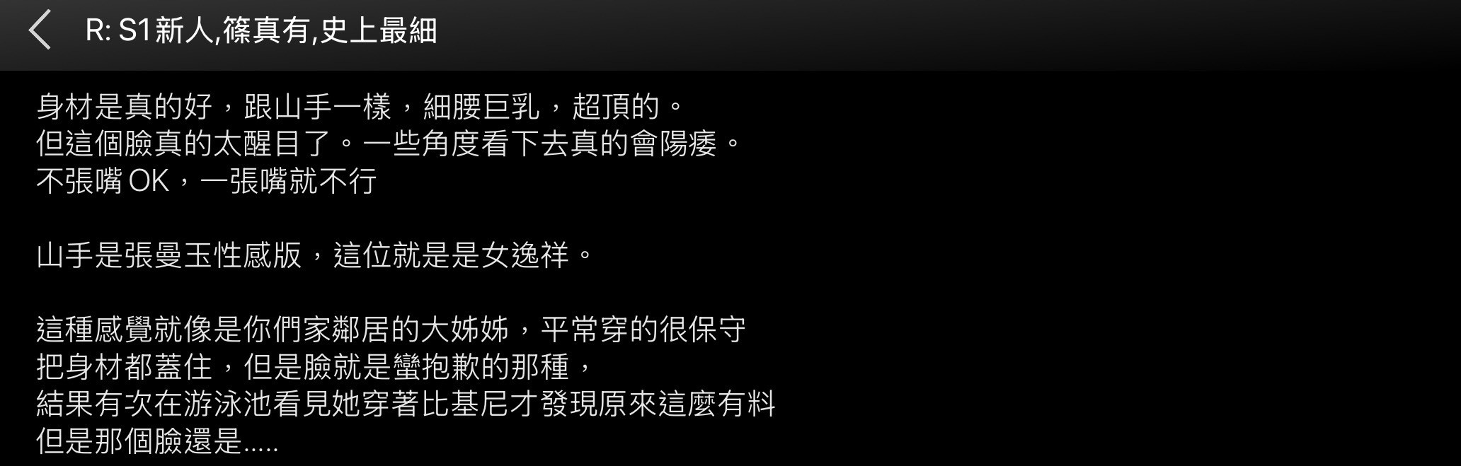 台湾论坛ptt对她的评价蛮惨的,说筱真有「一张嘴就不行」、还用「逸祥」来形容她,虽然细腰巨乳的身材超顶但还是不行,在推文更是有很多人质疑S1的选秀标准、觉得他们和赌神一样今晚大失水准ー在这边我无意和大家对着干,要和大家说的是筱真有是知道自己的问题所在而且有积极应对的: