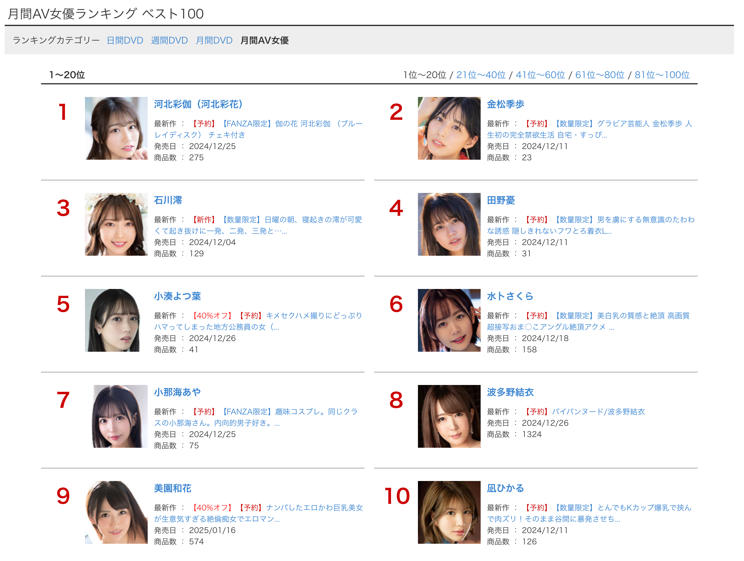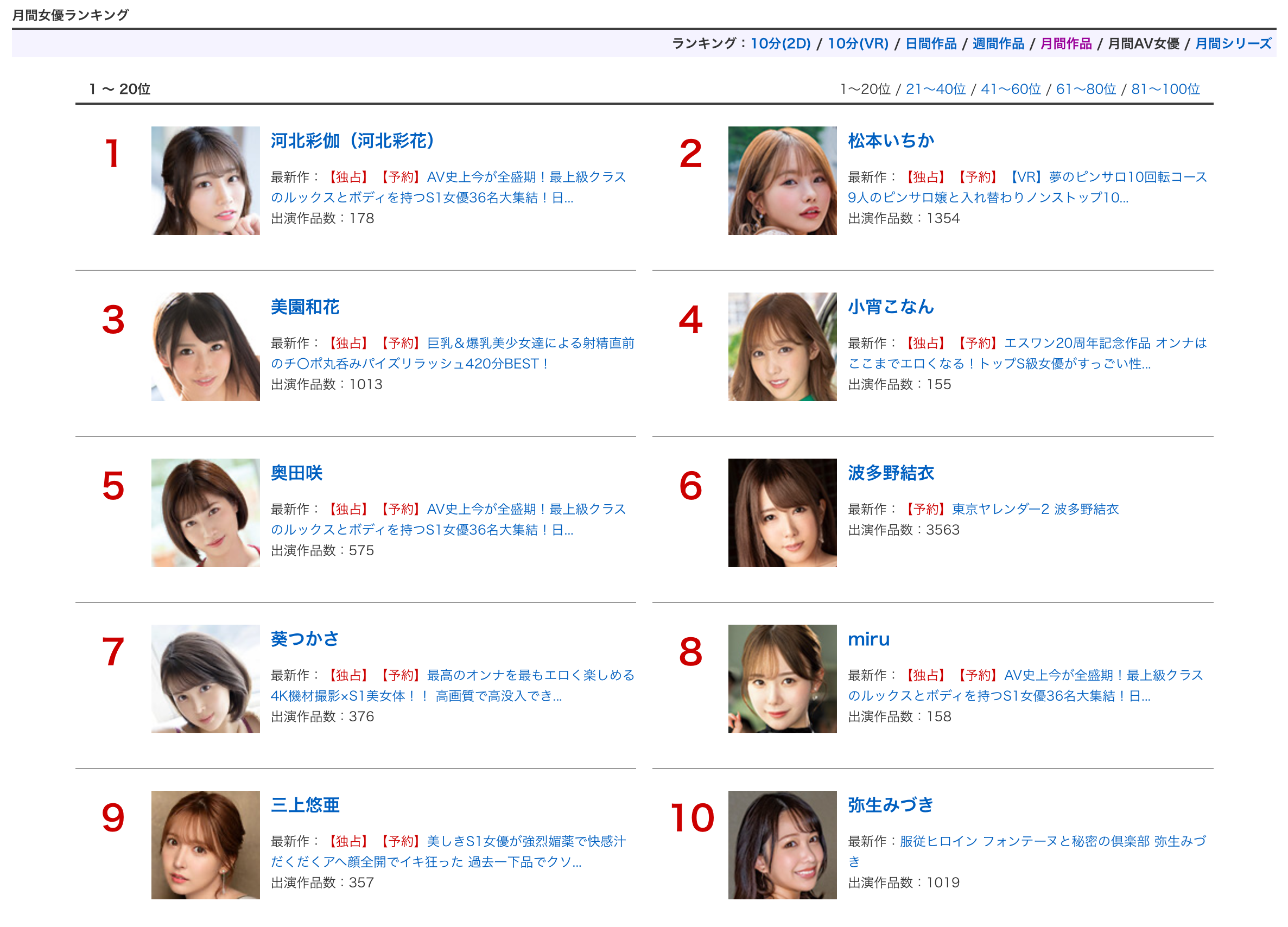 小弟我取材的是Fanza(https://www.dmm.co.jp/top/)实体片的销售排行榜,之所以报导这个排行榜是因为在这个时代愿意付费买实体片的都是真男人,一定是对女优有爱才会花钱消费,所以用这个排行榜比较容易知道谁是现阶段最红的女优: