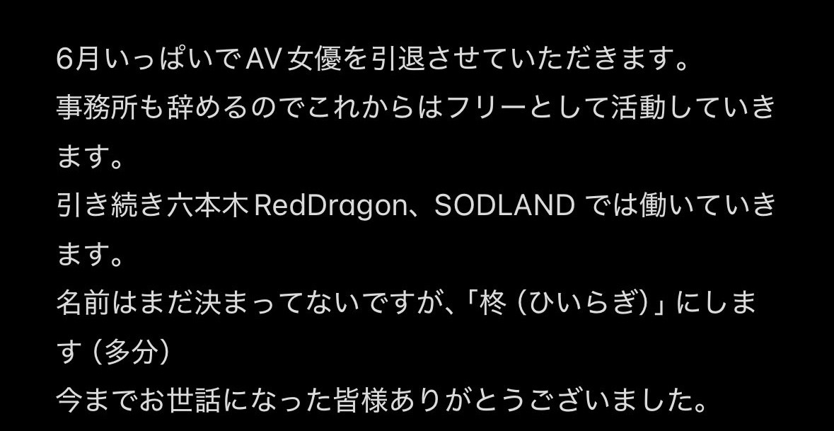 简单翻译一下她的声明:柊ゆうき(柊优希)说自己将在6月底的时候辞去AV女优的工作,同时离开公司,今后将以无(furiー,就是没有公司)的身份继续活动,会在六本木的红龙酒店(RedDradon)陪酒、还有在SODLand出席活动,新的名字尚未确定,不过大概会用「柊」这个名字…