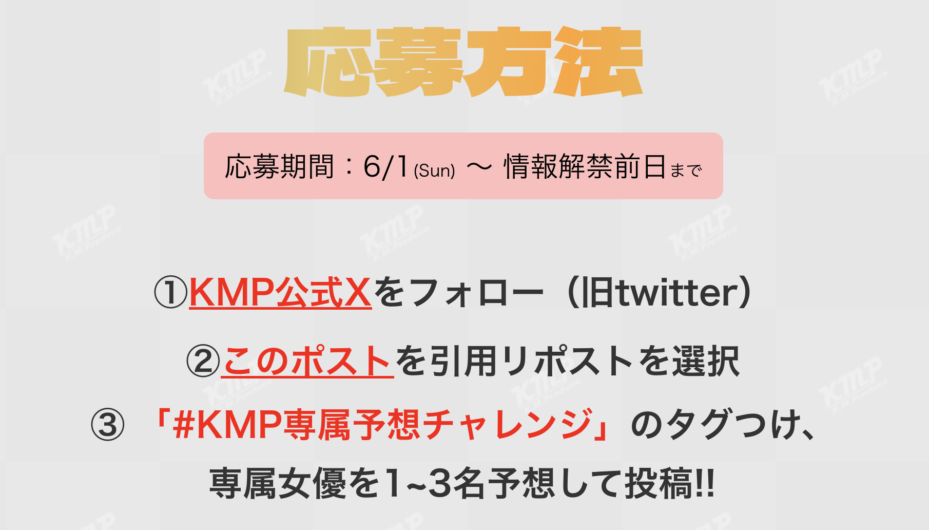为什么这么说?因为KMP集团在社群推出的「#KMP専属予想チャレンジ」除了要求大家标记,你还必须去猜到底是谁会成为他们的专属女优ー聪明的你一定看出来了,如果是还没有发片经验的新人那根本不用猜,因为没出道的人是要猜啥小?所以这三位女优肯定是有过发片经验而且小有名气的人,在市场上漂泊的他们收到了KMP集团的专属契约,有家惹~