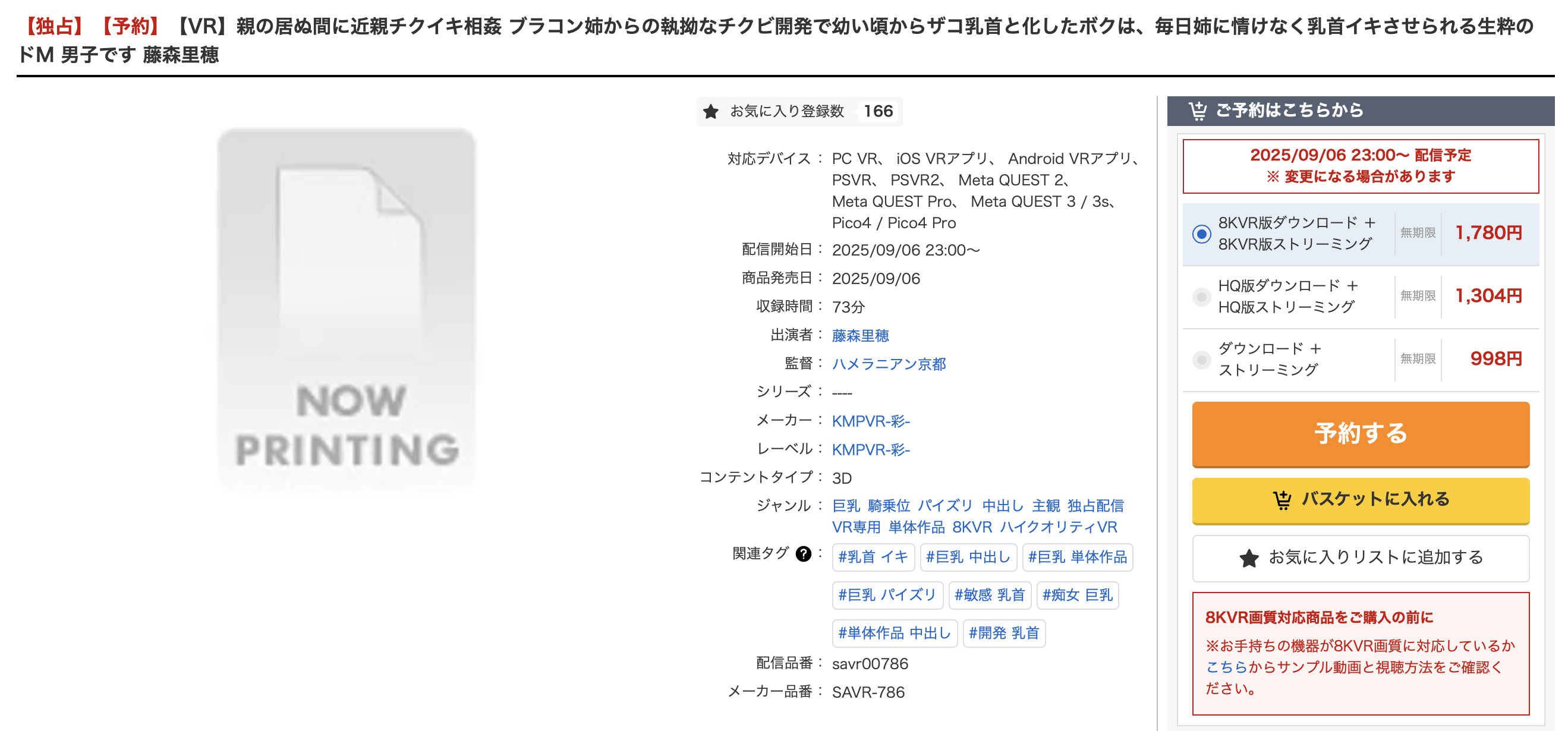 还有这部由电影公司 KMPVR-Sai 发行的无封面 VR 影片,名为《VR:趁父母不在,乱伦乳头高潮。姐姐给我戴了个手套,从小我的乳头就被无情地开发,把我变成了湿漉漉的乳头。我是一个货真价实的受虐狂男孩,可悲的是,我每天都被姐姐强迫用乳头达到高潮》。