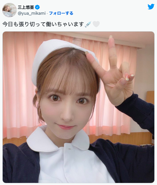 因為不久前她在社群上傳了一系列護士服的照片,因為三上自出道到現在只有在「国民的アイドル三上悠亜の31コス! コスった悠亜で毎日シコって4時間31変化SP」扮演過護士,但她始終沒有一支全程扮演護士的作品,這次似乎是要解禁了…