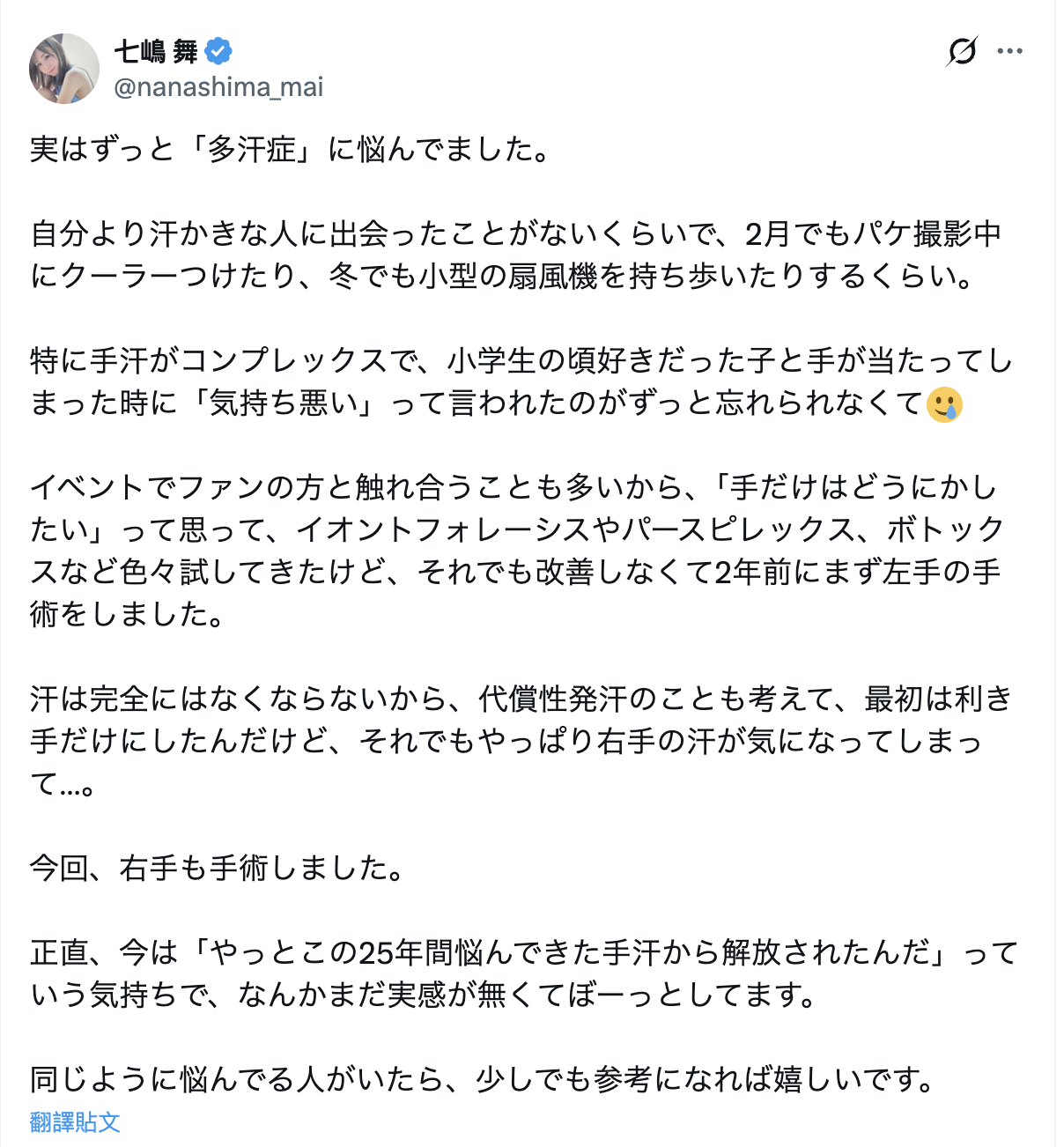 可能有些人觉得只要事先讲清楚,能体会七嶋舞的手汗也是一种与众不同的滋味,不过七嶋舞在发文中写了,她手汗之严重,是即使到了冬天拍片都要开冷气、出门也要带电风扇的程度;而在小学时不小心碰到喜欢男生的手结果被骂「恶心」更让她到了长大都自卑,由于自己的工作需要和影迷好好互动,所以打从出道她就想办法解决,用过止汗剂,也打过肉毒但都没效果,所以她先动手术解决了左手出汗的症状,现在则是动了右手的手术: