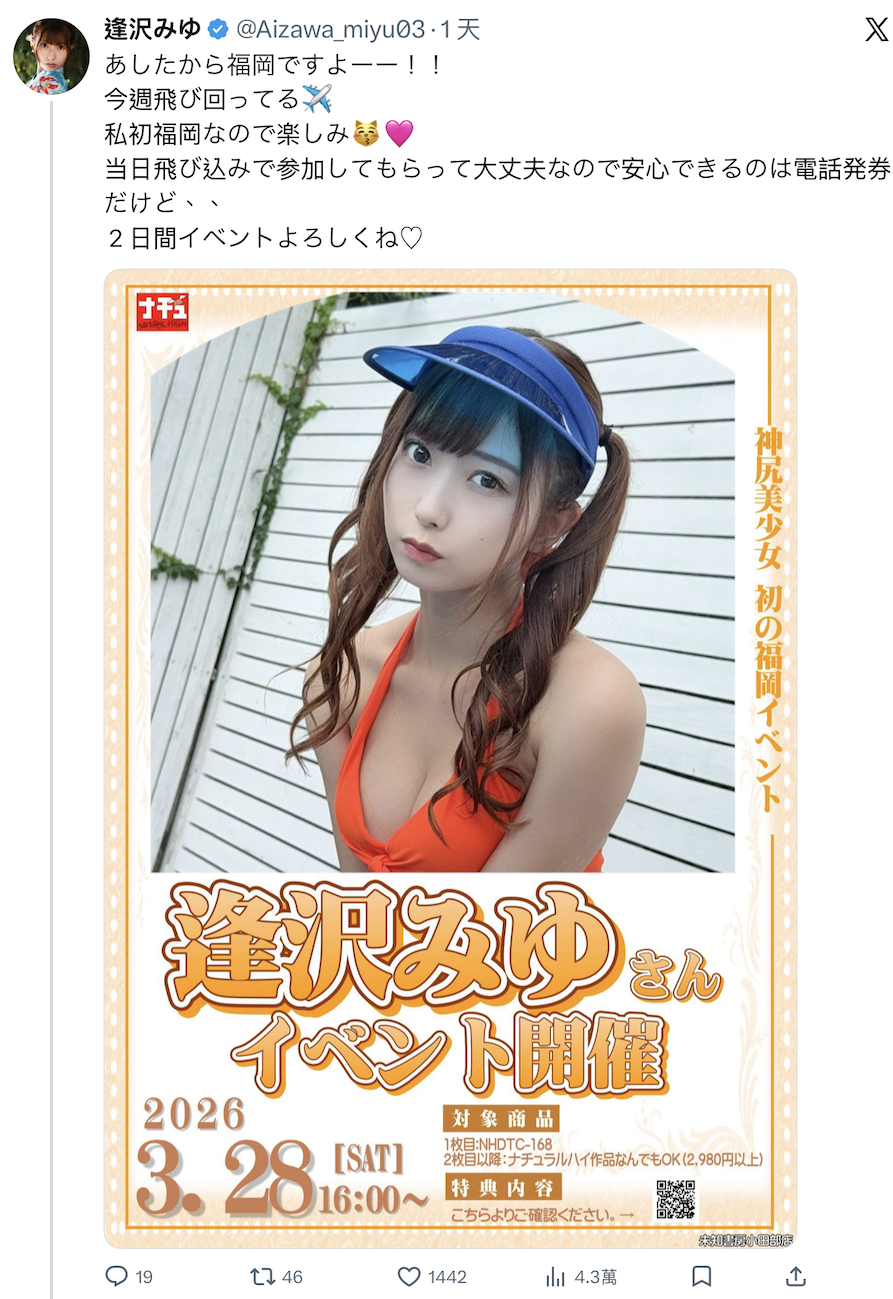 除了拍片之外,逢沢みゆ(逢泽美优)还是乐于活动的女优,这两天她都待在福冈举办见面会,也就是说她不但办活动、而且还长程移动到了九州,虽说没有一定人气是无法到东京以往的外县市举办活动的,但考量到她拍片繁忙的行程,这仍然是非常恐怖的体力消耗啊⋯