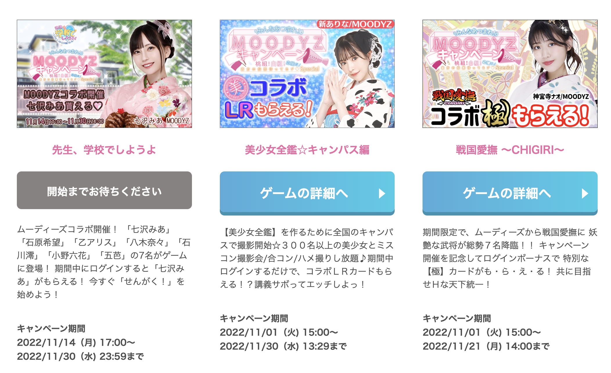 至于这个宣传活动怎么么玩呢?因为帮忙宣传的女优很多,所以Moodyz把女优们分成了桃组和白组展开竞赛:桃组是由新ありな(新有菜)站在C位,白组则是让七沢みあ(七泽米亚)站在中间,Moodyz是由通贩(实体作品65折起,多买还送特典影像)、500円(台币110元)的MOODYZキャンペーン2022 specialDVD、原创商品(File夹、生写真套组、人形立牌)以及女优身上的泳装拍卖来看看白组桃组谁的人气高,另外,还有数位写真集发售、女优也会参加线上聊天室宣传这个促销活动,最后还与电玩游戏连动,你可以在游戏中使用Moodyz的女优打天下: